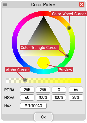 The dialog lets you define a color by moving the Color Wheel Cursor inside the Color Wheel to set the hue, and the Color Triangle Cursor inside the Color Triangle to set the saturation (horizontal) and value (vertical). The circle below the triangle shows you the preview. Depending on which kind of color you are defining, an Alpha Value (opacity) can be set by using the Alpha Cursor inside the Alpha Rectangle, and placing it somewhere between completely transparent (left) and opaque (right).