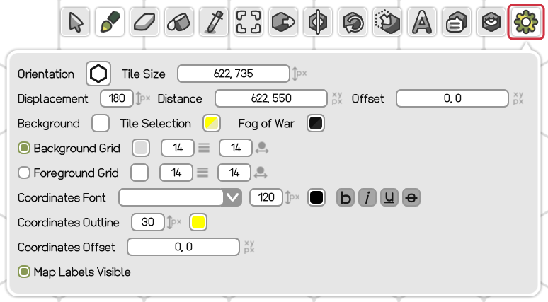Map Properties Button in the Toolbox or by pressing I. Within, the overall properties of the map can be changed, with the map adapting immediately with the changes you make. Map properties are saved inside the map file. You can set the default map properties for new maps in the Settings. My tile packs have the proper map property settings written in their respective documentation.