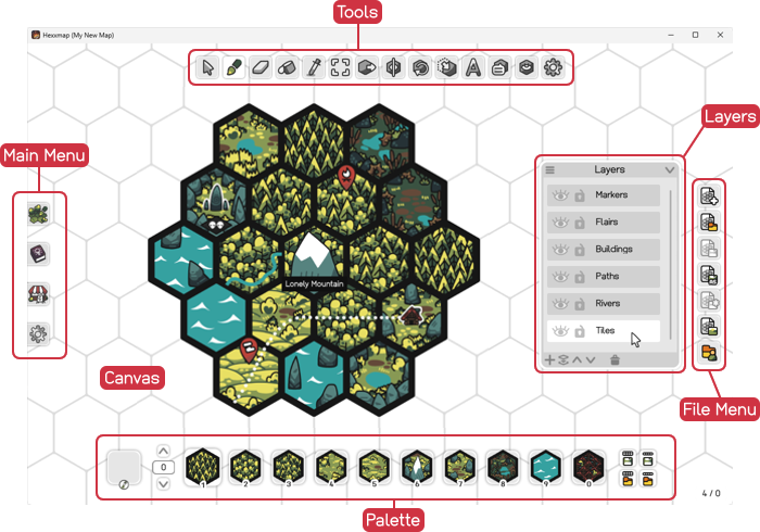 Most of the screen is covered by the Canvas, where you will place your tiles. At the top you'll find the Toolbox to paint, erase and manipulate tiles on the canvas. Use the Palette at the bottom to select the tiles to paint. If you move the cursor near the left window side, the Main Menu pops up, giving you access to the program settings. On the right side you have the File Menu for loading and saving maps. The Layers dialog can be placed anywhere on the screen and even be collapsed so it's out of the way.