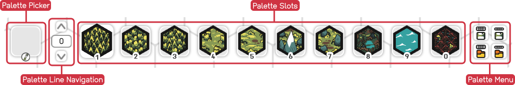 The Palette consists of, from left to right, the Palette Picker, the Palette Lines Navigation, the Palette Slots and the Palette Menu.