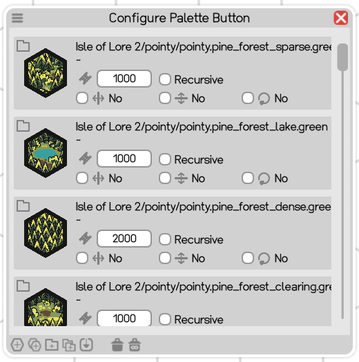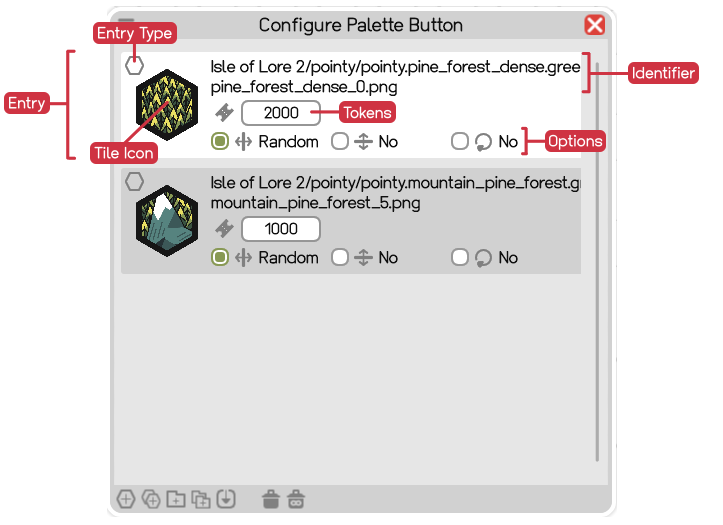Each Palette Entry contributes tiles to the Palette Slot. Each entry represents either a single tile, a folder of tiles or a reference to another slot, each explained in detail further down below. Within the dialog, the Entry Type is represented by an icon in the top left corner. Below that there's a Tile Icon representing the entry. Next to it, the entry lists its Identifier, its Tokens and further Options.