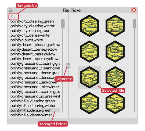 There's also a cool hidden feature which is called Tile Identifier Rotation. If the Brush Tool is placed on a tile, hold Ctrl and use the mouse wheel. If the tile is part of the identifiers of the currently selected Palette Slot, the mouse wheel will make the tile rotate through all possible tiles (in ascending or descending order depending on if the mouse wheel is scrolled upwards or downwards). This is a great way to change a certain tile, for example a mountain tile, into a very specific tile from the set of mountains, but as said, the selected Palette Slot must contain that identifier somehow.