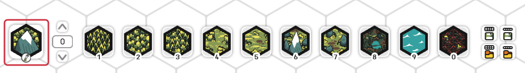 Palette Slots work similar to action bars in video games, but the slots are filled with tiles to paint with. Clicking on a slot or pressing the keys 0 to 9 selects the respective slot and thus determines which tiles are used when painting with tools like the Brush Tool. Right-clicking on a slot will open the Configure Palette Button Dialog.