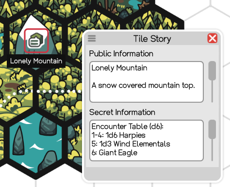 The Tile Story Tool is used to give tiles textual context. Clicking on a tile while the tool is selected will show the Tile Story Dialog where you can write public (player-facing) and private (hidden) information. A Tile Story Icon indicates which tiles have a story attached to them. The icon is colored for the currently inspected tile, and grayed out otherwise.